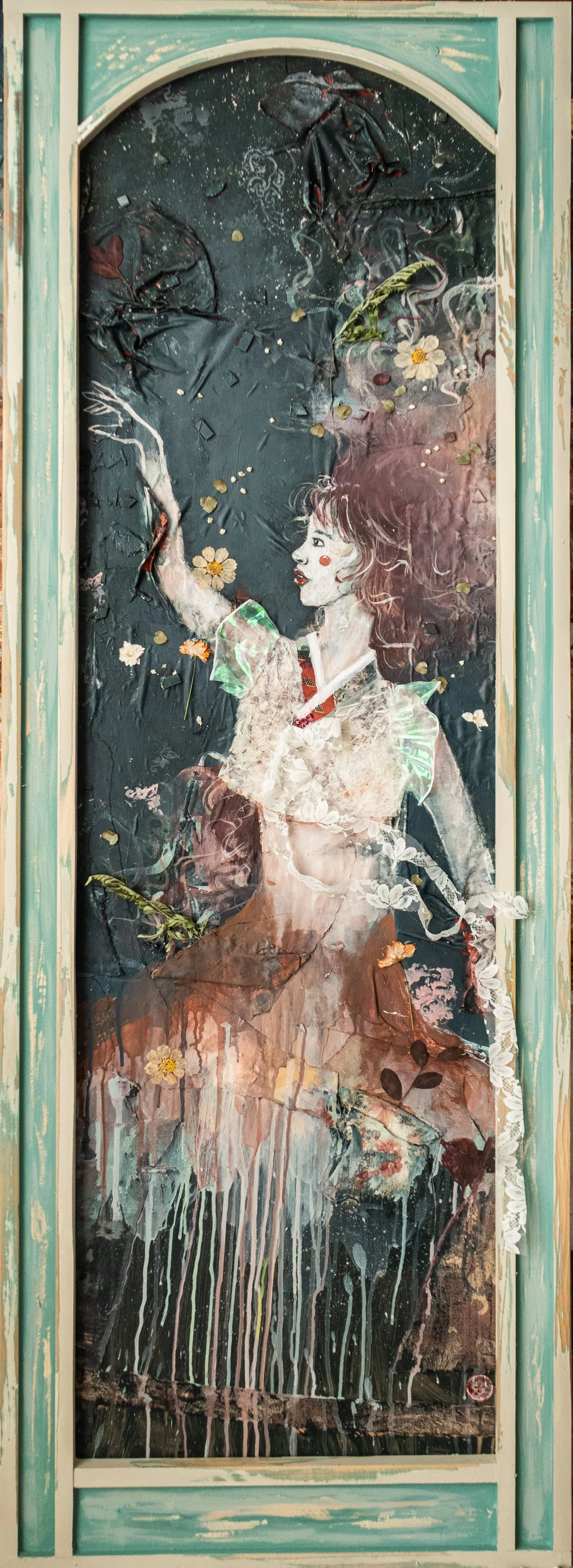 Medium: Photoprint on watercolor paper, oil pastels, color pencils, graphite, scrap paper, acrylic paint, oil paint, plaster, modeling paste, fabric